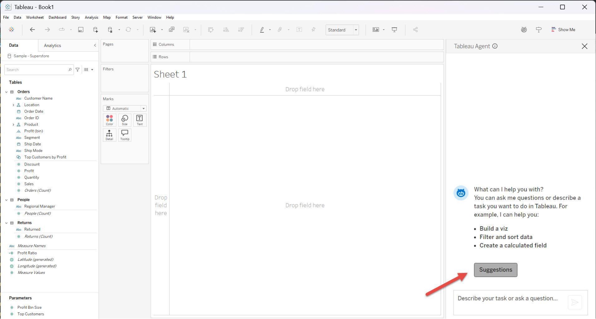 As a practical introductory example, we first establish a connection to the Superstore dataset in Tableau and then open the Agent panel. Instead of manually dragging fields into the workspace, the Agent suggests context-related questions: