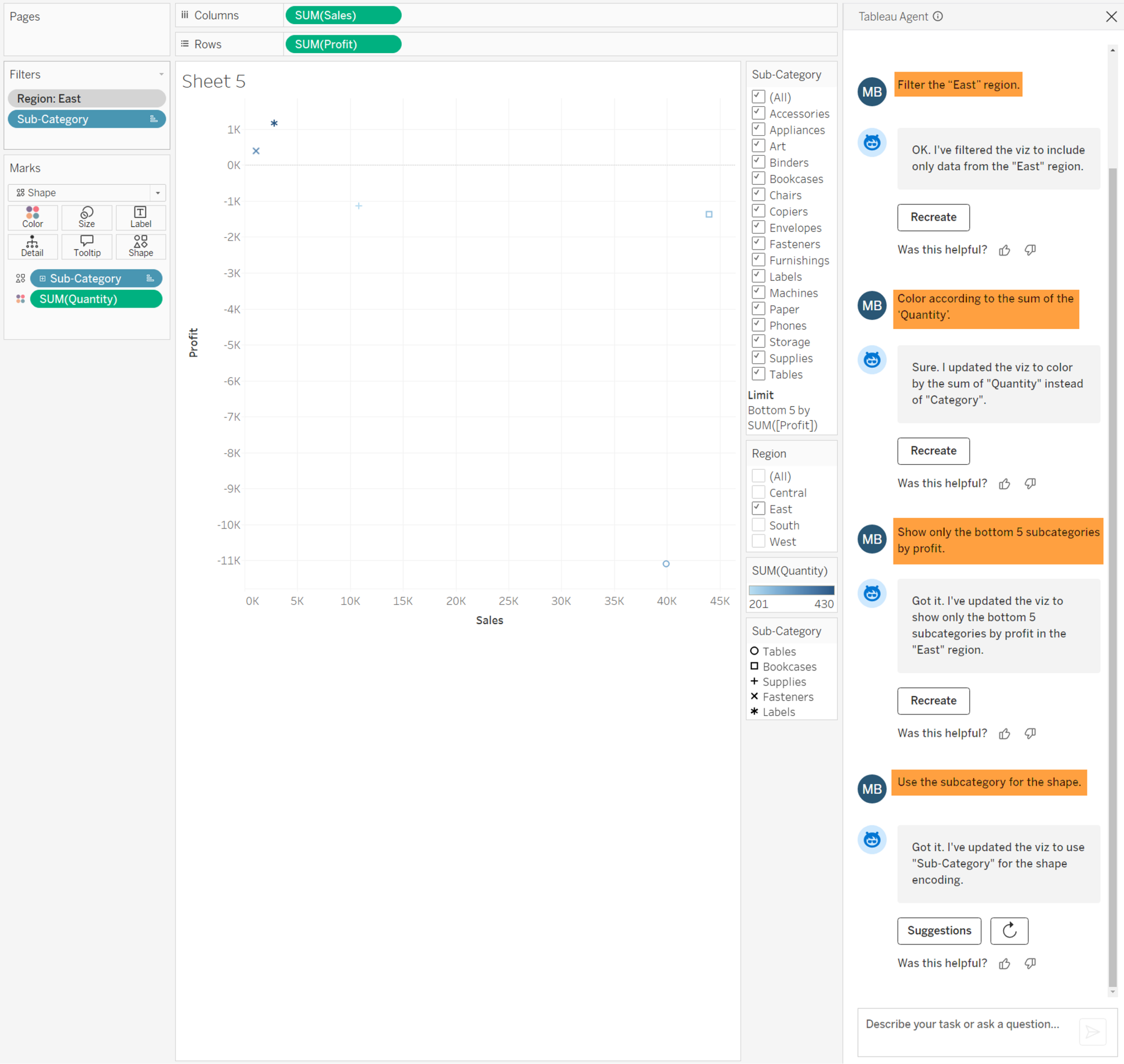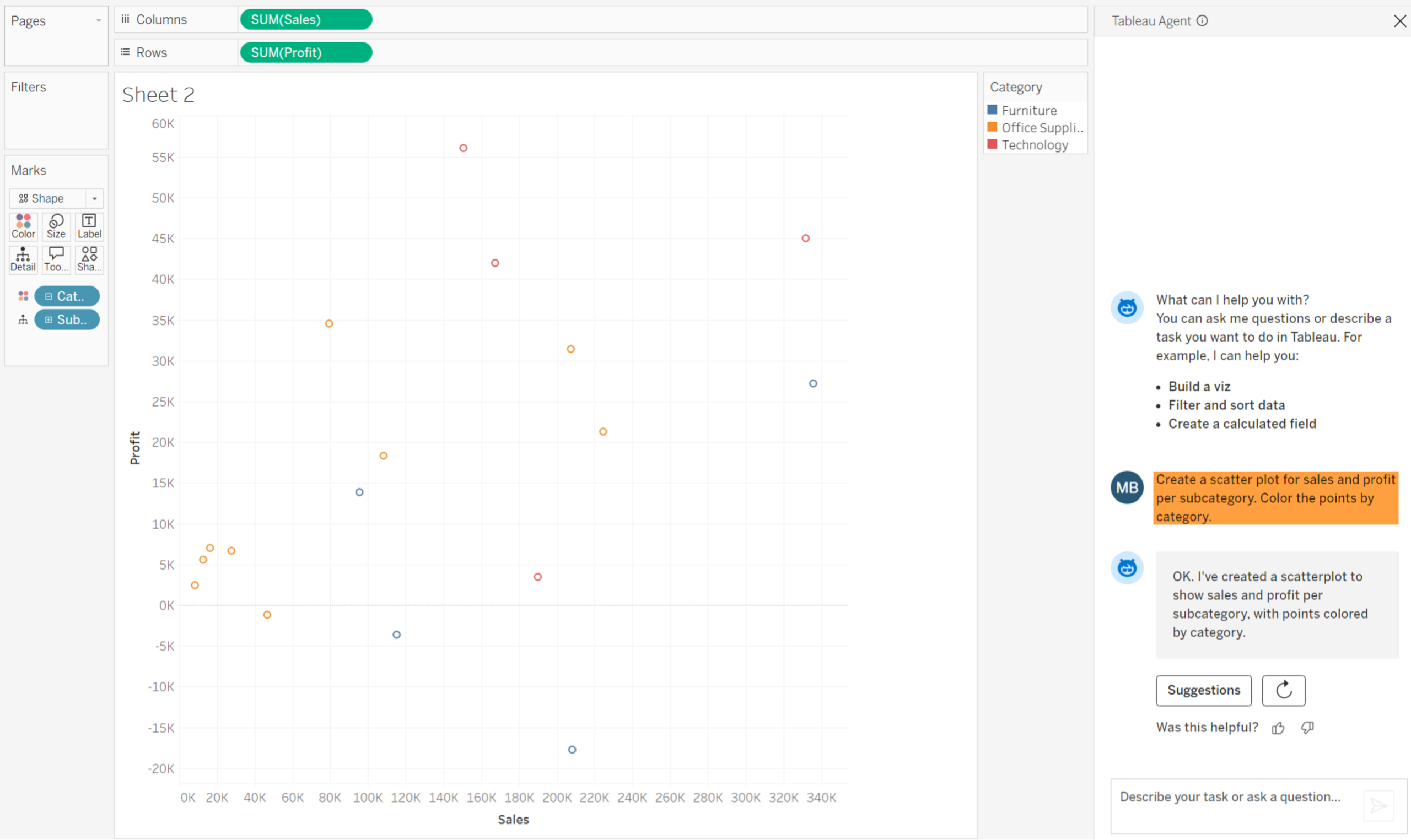 Traditionally, this requires several steps: selecting the correct chart type, placing the measures on the correct axes, and adding dimensions for granularity and color. With the Tableau Agent, we can formulate this desire in natural language.