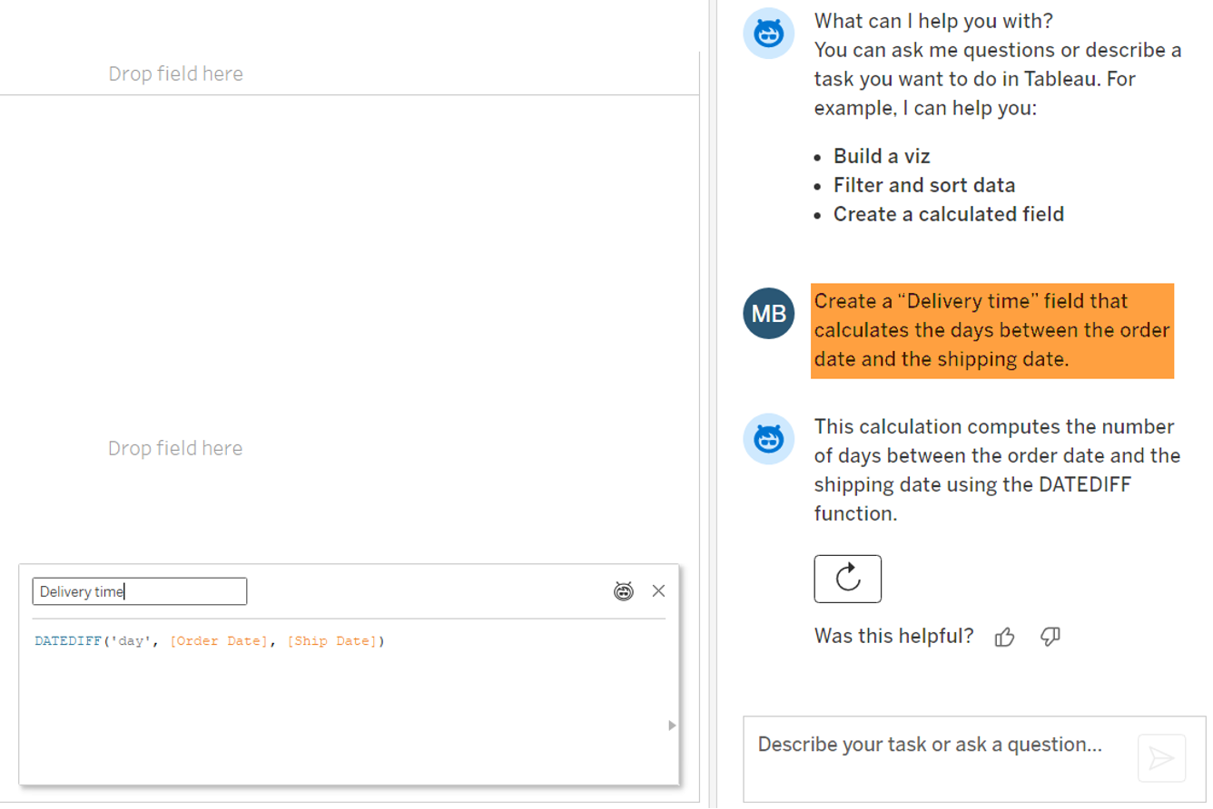 Result: The Agent generates the code DATEDIFF(‚day‘, [Order Date], [Ship Date])It automatically recognizes the relevant date fields in the Superstore dataset and selects the appropriate function.