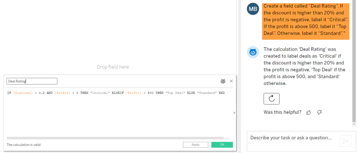The Tableau Agent acts as a “translator” here. The analyst provides the business requirements, and the AI delivers the correct code.