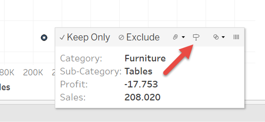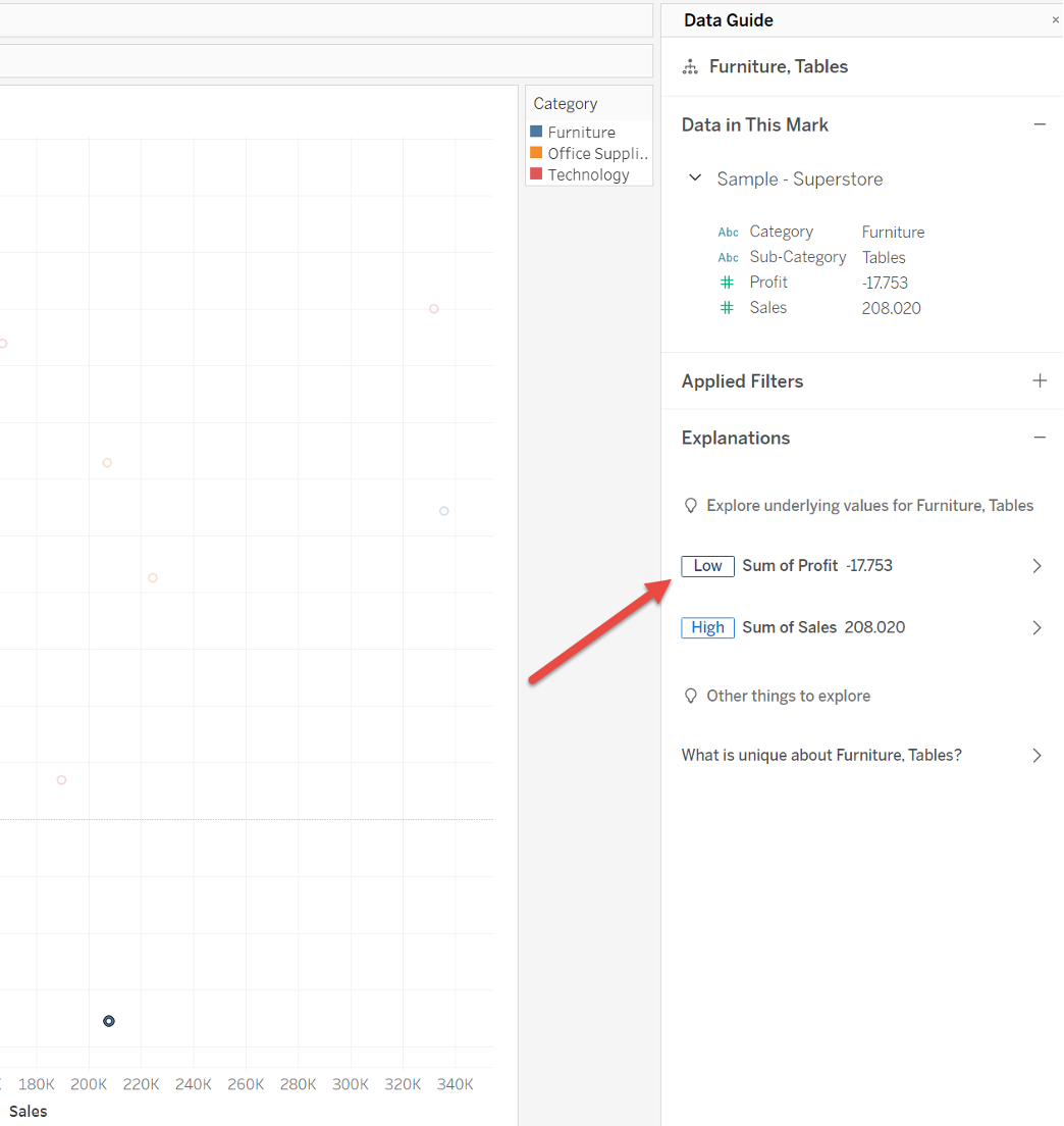 - Click on the noticeable data point in the visualization (e.g., the point for “Tables”).