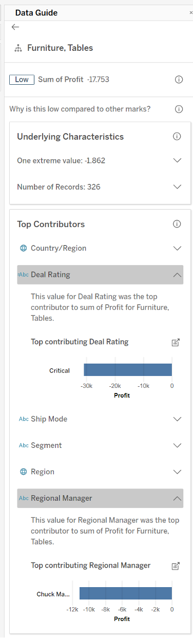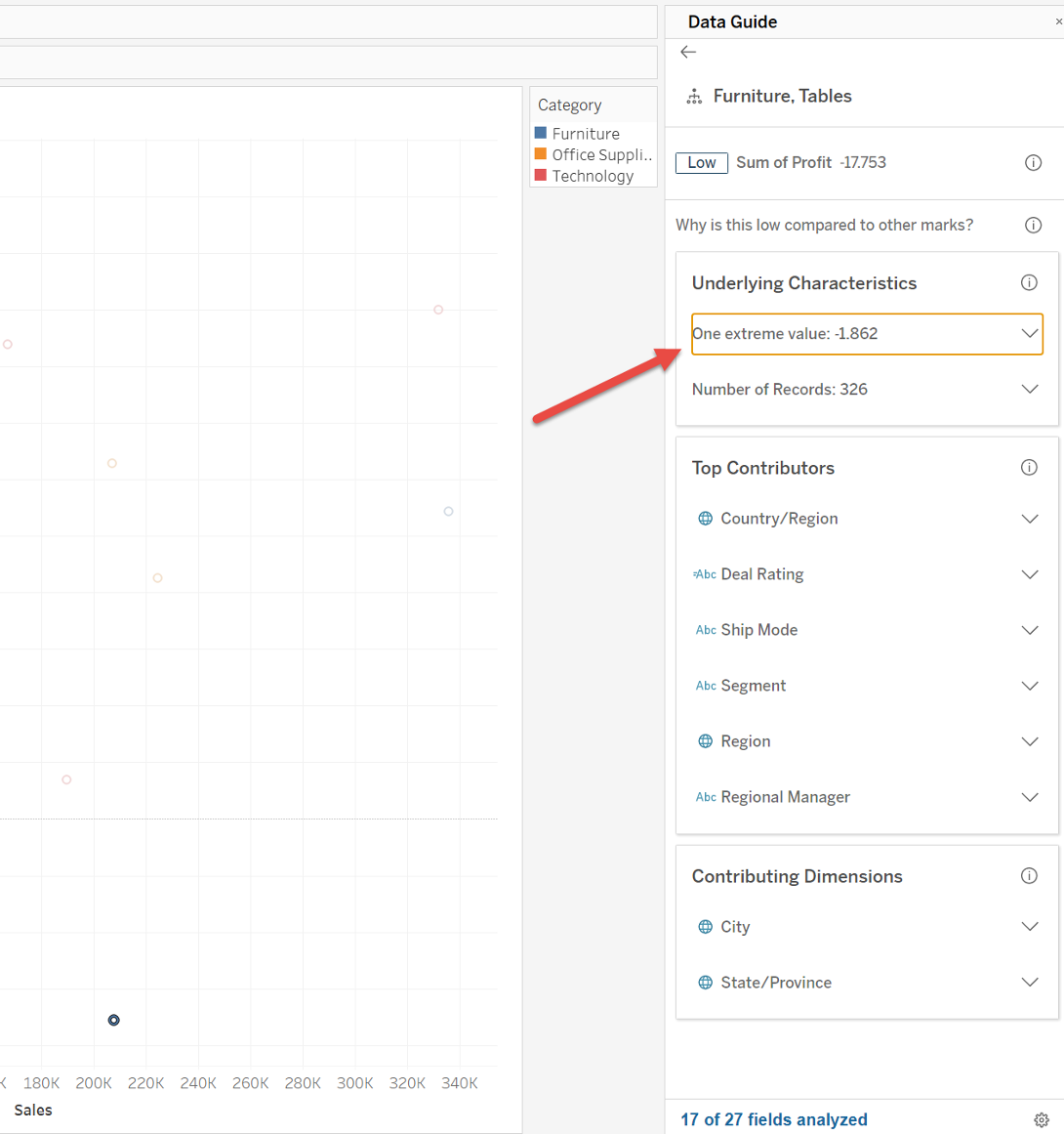 The Result: The Explain Data pane with the main characteristics of the selected data point is displayed in the right sidebar. There you can determine which values should be examined in detail. In this case, our interest lies in the "Profit," which is already classified as “low.”
